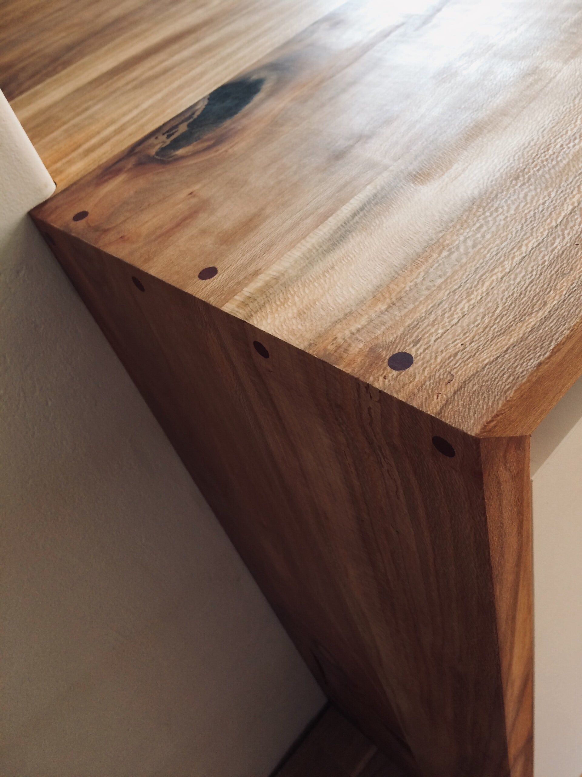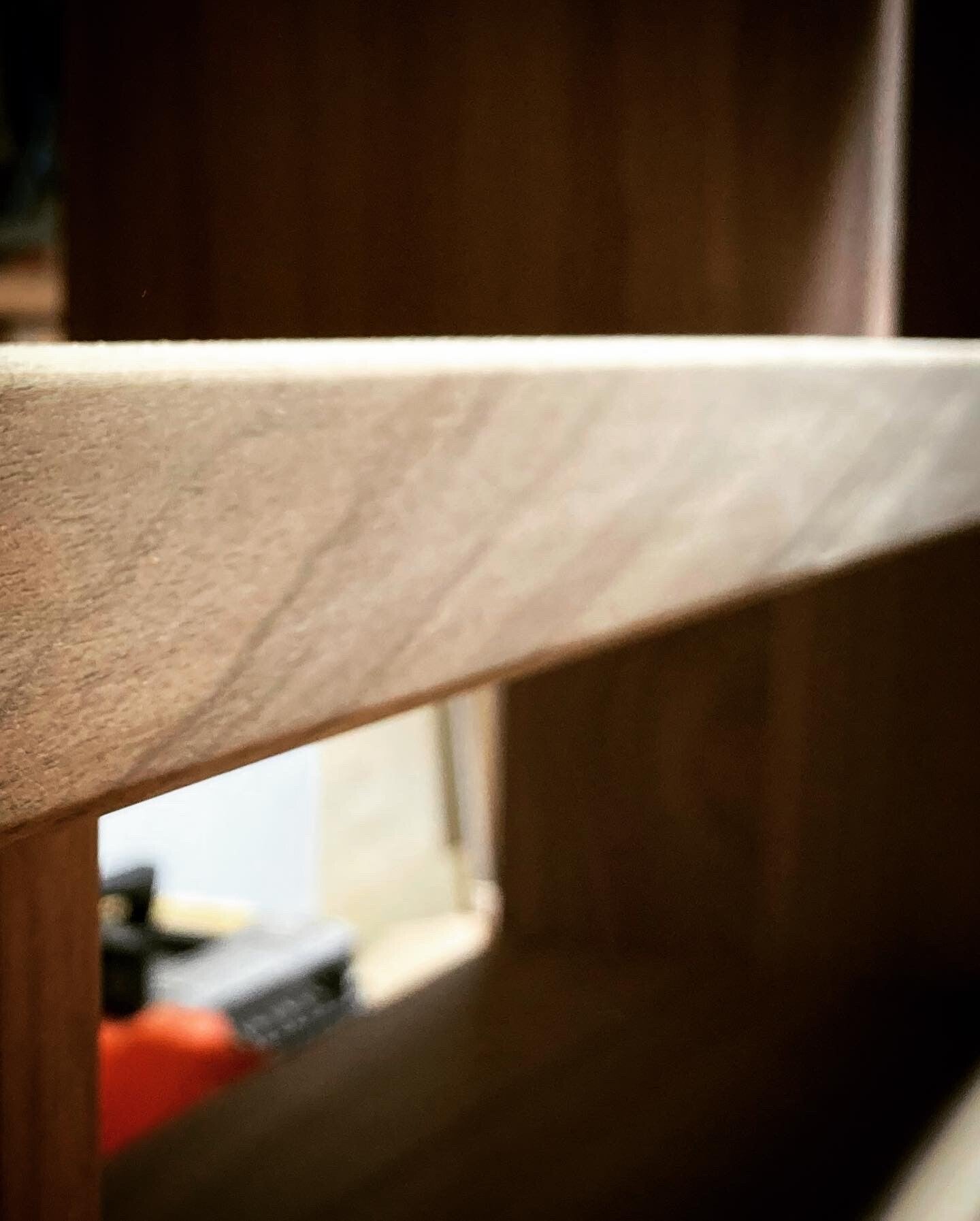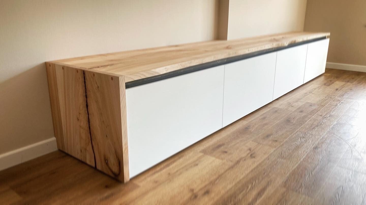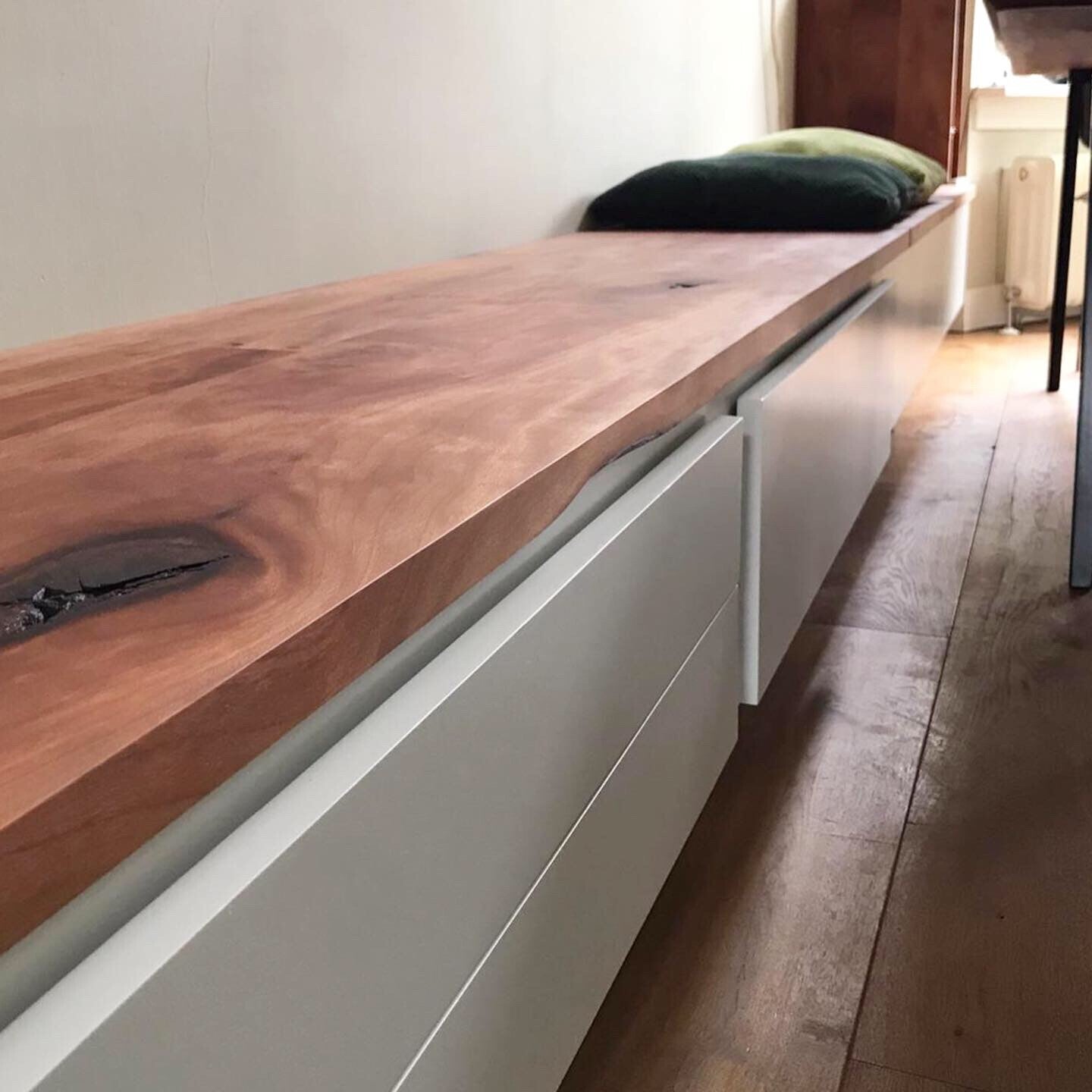 Wandmeubel noten edelplaat met massief walnoot deklatten ↓